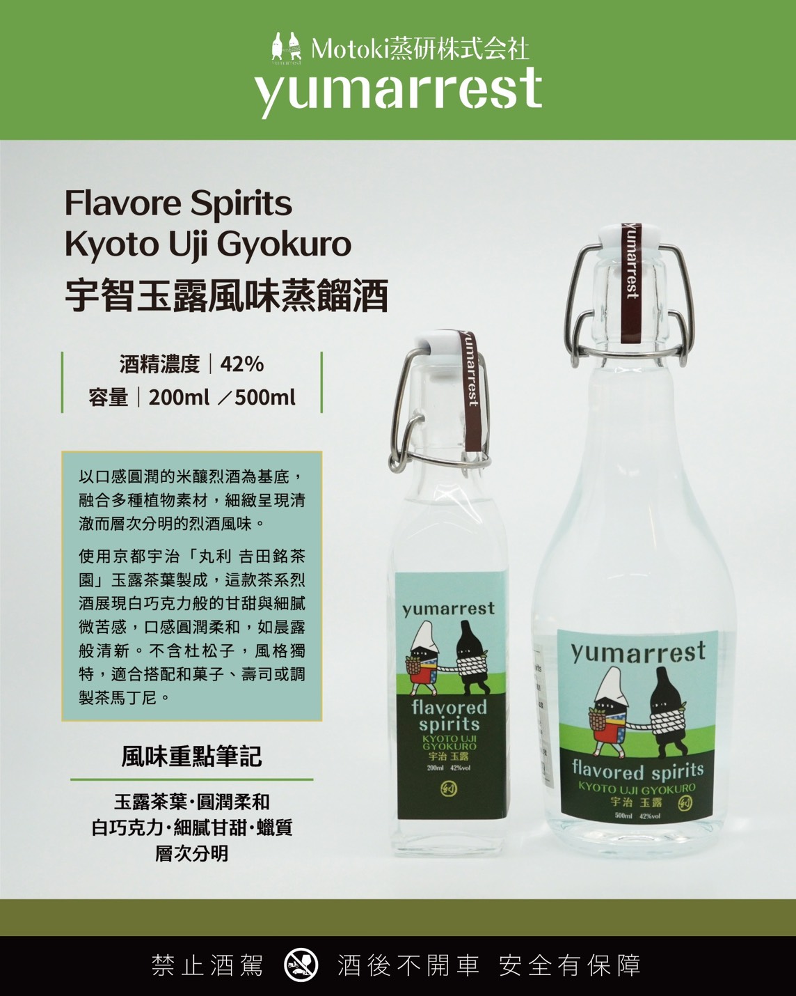 來自京都宇治的細緻茶香,與蒸餾工藝的純粹結合,造就了Kyoto Uji Gyokuro宇治玉露風味蒸餾酒。以米釀烈酒為基底,融合玉露的獨特清香與白巧克力的圓潤甘甜,讓口感柔和而飽滿。每一口都像是高雅茶湯在舌尖綻放,層次清晰而富含深度。
