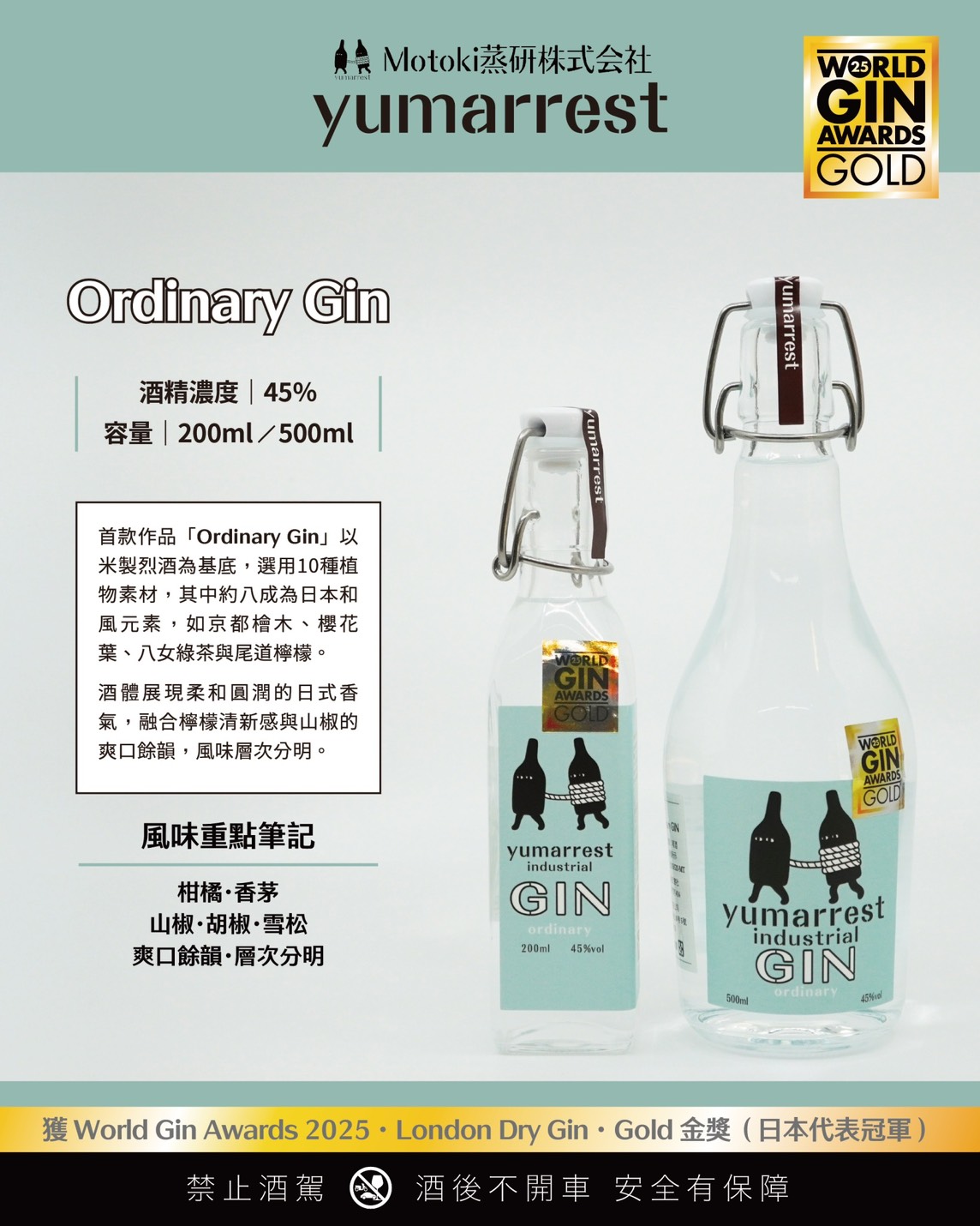榮獲 World Gin Awards 2025 金獎 的肯定,Ordinary Gin 既適合純飲,展現自然爽快的原始風味,也能調製成 Gin & Tonic,釋放更多柑橘與辛香層次。它不只是品牌的起點,更是日本風土與精緻工藝的代表之作。